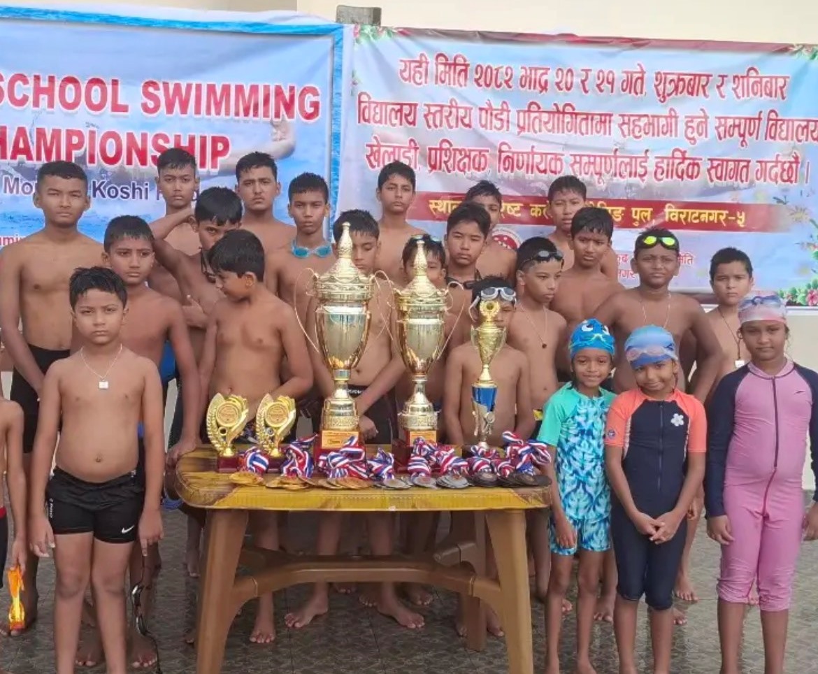 विराटनगर । विराटनगर–५ स्थित एभरेष्ट सेकेन्डरी स्कुल २१ वटा स्वर्ण पदक सहित अन्तर विद्यालय पौडि प्रतियोगितामा प्रथम भएको छ । शुक्रबार र शनिवार सम्पन्न प्रतियोगितामा विराटनगरकै दिल्लि पब्लिक स्कुल (डीपीएस) ६ स्वर्ण पदकसहित दित्तिय भएको छ भने सेन्ट मेरी स्कुल २ स्वर्ण ३ रजत र ७ कास्य पदक सहित तेस्रो भएको छ ।