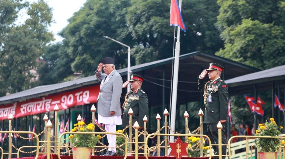 काठमाडौँ, असोज १३ गते । राष्ट्रपति रामचन्द्र पौडेलको प्रमुख आतिथ्यमा सैनिक मञ्च टुँडिखेलमा आज अपराह्न ‘फूलपाती बढाइँ समारोह–२०८२’ सम्पन्न गरिएको छ । समारोहमा नेपाली सेनाका परमाधिपति राष्ट्रपति पौडेलको सम्मानमा नेपाली सेनाले सलामी अर्पण गरेको थियो ।