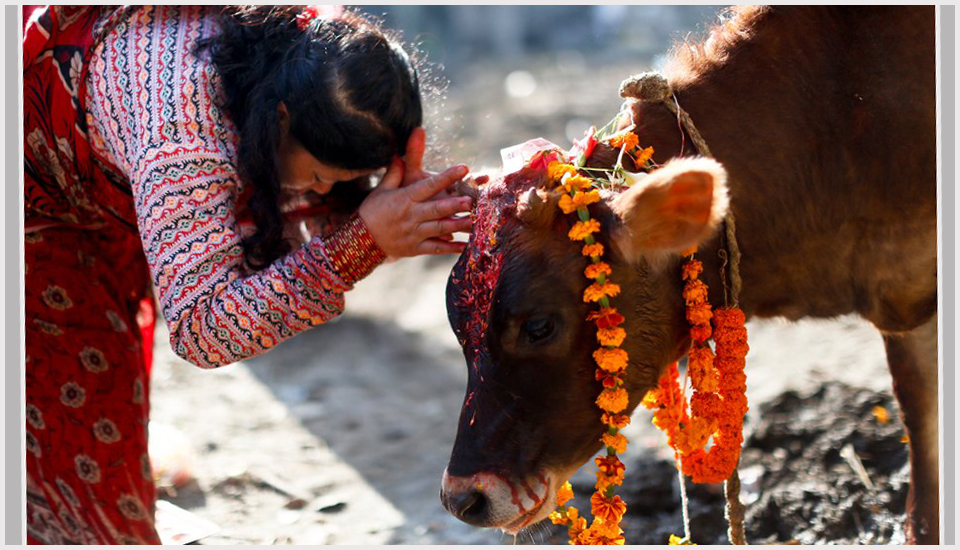 काठमाडाैं / आज गोवर्धन पूजा अर्थात् यम पञ्चकको चौथो दिन । काग, कुकुर गाई हुँदै आजको दिन प्राचीन कृषि कार्यमा संलग्न जीव गोरुको पूजा गर्ने गरिन्छ । कृषि प्रधान देश नेपालमा आजको दिनले आफ्नो अणुवांशिक पहिचान गुमाएर साँढेबाट हल गोरुमा परिणत जीवले हाम्रो कृषि जीवनमा राखेको महत्त्वका कारण सम्झिने गरिन्छ ।