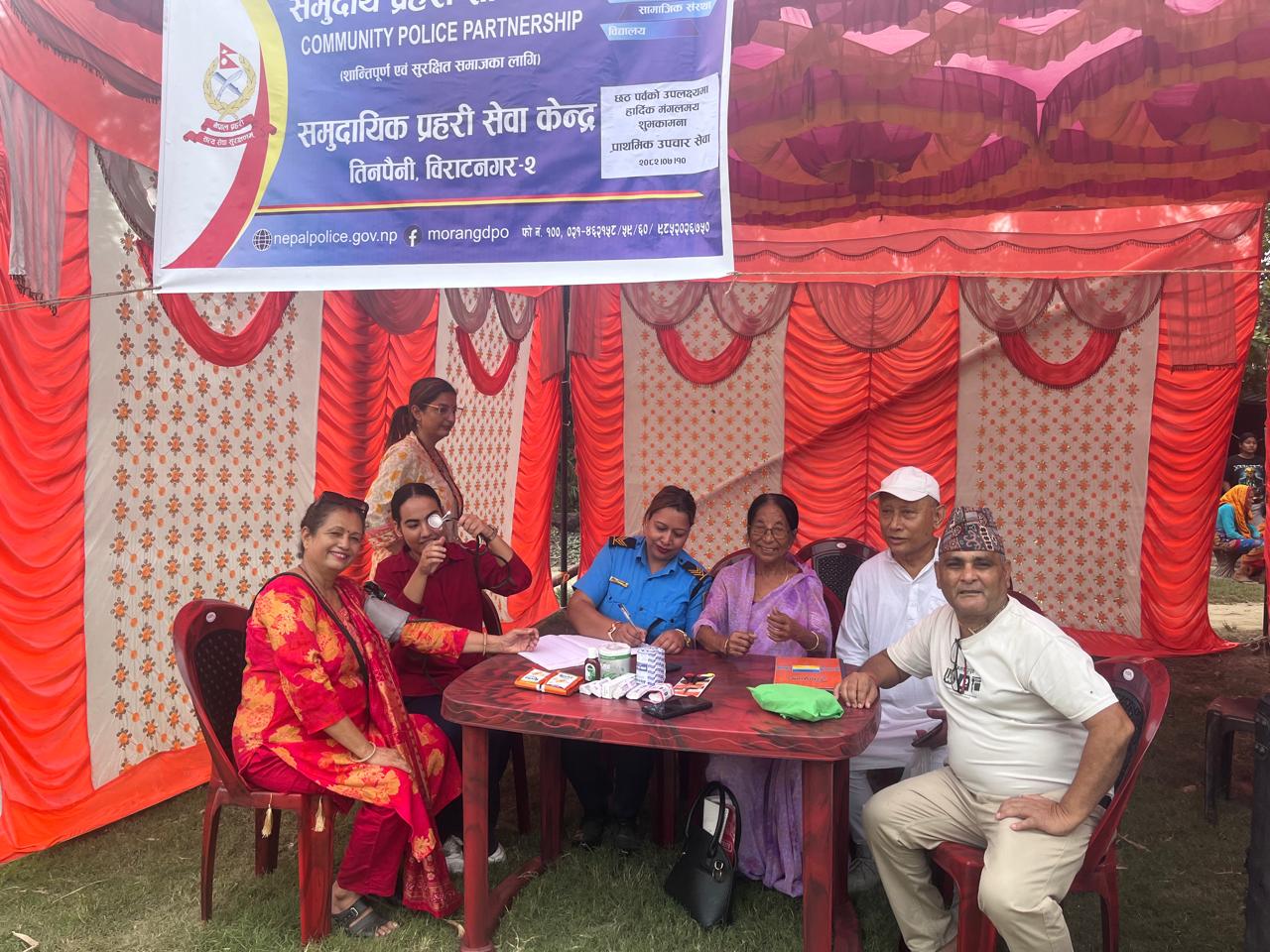 छठ पर्वको अवसरमा सामुदायिक प्रहरी सेवा केन्द्र, विराटनगर–२ तीनपैनीले सोमबार विराटनगरको सिँघिया घाटमा निःशुल्क स्वास्थ्य शिविर आयोजना गरेको छ। हरेक वर्षझैं यस वर्ष पनि व्रत बसेर पूजा गर्न आउने भक्तजनहरूको भीडलाई ध्यानमा राख्दै केन्द्रले यो शिविर सञ्चालन गरेको हो। कार्यक्रम केन्द्रकी अध्यक्ष मिना जोशीको अध्यक्षतामा सम्पन्न भएको थियो। कार्यक्रममा सचिव भोजराज घिमिरे, कोषाध्यक्ष सन्तोष बाहेती, कार्यसमिति सदस्य, सल्लाहकारहरू तथा पदेन प्रहरी कर्मचारीहरूको सक्रिय उपस्थिति रहेको थियो। शिविरमा व्रतधारी भक्तजनहरूको रक्तचाप, रक्तमा सुगर (ग्लुकोज) परीक्षण तथा प्राथमिक उपचार सेवा प्रदान गरिएको थियो। यस कार्यक्रममा नेपाल रेडक्रस सोसाइटी, मोरङले चिकित्सक तथा एम्बुलेन्स सेवा उपलब्ध गराएर सहयोग गरेको केन्द्रले जनाएको छ। सामाजिक उत्तरदायित्वअन्तर्गत प्रत्येक वर्ष विविध सामाजिक सेवा कार्यमा अग्रणी भूमिका निर्वाह गर्दै आएको सामुदायिक प्रहरी सेवा केन्द्रले यस वर्ष पनि भक्तजनहरूको स्वास्थ्य सुरक्षाका लागि यस्तो जनसेवा कार्यक्रम सञ्चालन गरेको हो।