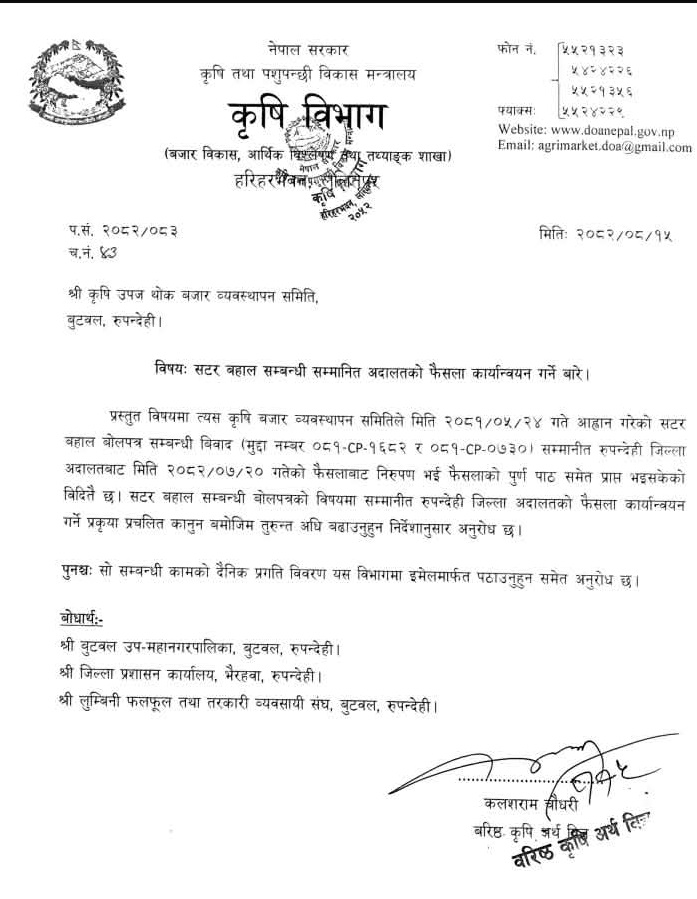 कृषि उपज थोक बजार व्यवस्थापन समिति बुटवललाई मङ्सिर १५ गतेको पत्र लेख्दै विभागका वरिष्ठ कृषि अर्थ विज्ञ कलशराम चौधरीले अविलम्ब टेन्डर प्रक्रिया अगाडी बढाउन र अदालतको फैसला कार्यान्वयन गर्नको लागि निर्देशन दिएका हुन ।
