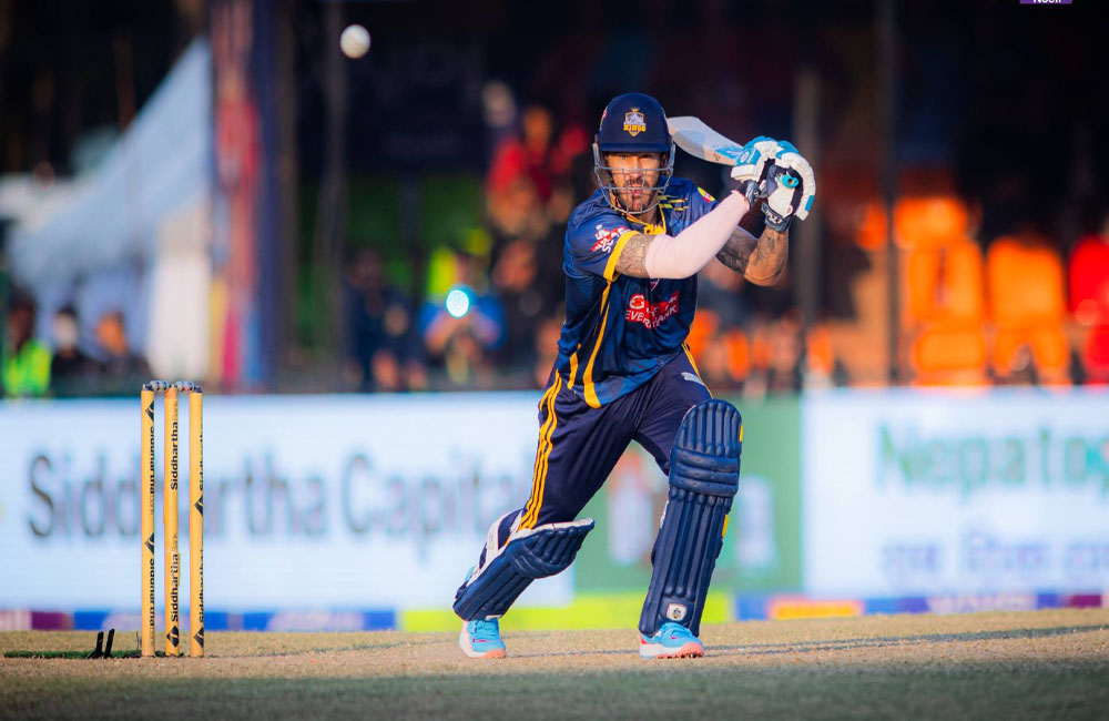 आजै पहिलो खेल खेल्नुभएका फाफ डुप्लेसी १२ रनमा आउट हुनुभयो । ओपनिङमा खेल्नुभएका डुप्लेसी खासै चल्न सक्नुभएन । बलिङमा लुम्बिनीका लागि शेर मल्लले तीन विकेट लिनुभयो । यस्तै अविशेष गौतम, जेजे स्मिथ र रुवेन ट्रम्पलम्यानले एक एक विकेट लिनुभयो ।