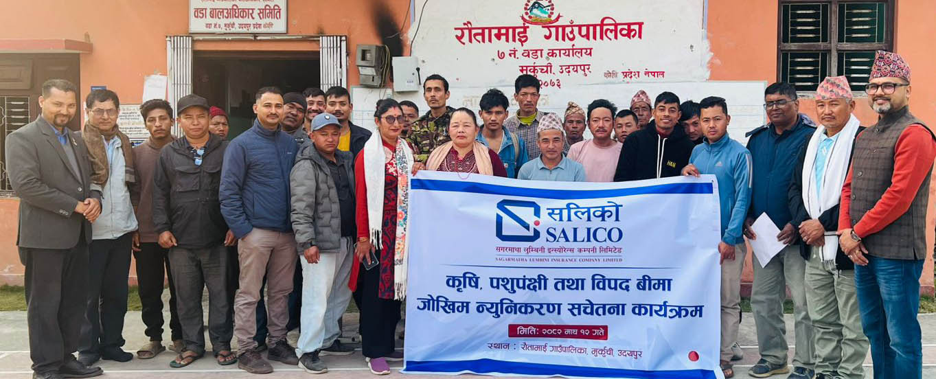 उदयपुर / उदयपुर जिल्लाको रौतामाई नगरपालिका-७ मा सगरमाथा लुम्बिनी इन्स्योरेन्स कम्पनी लिमिटेडको आयोजनामा कृषि, पशुपंक्षी तथा विपद् बीमा जोखिम न्यूनिकरण सम्बन्धी छलफल तथा सचेतना कार्यक्रम सम्पन्न भएको छ ।