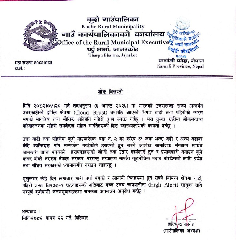 जाजरकोटको कुशे गाउँपालिकाका अध्यक्ष हरिचन्द्र बस्नेतले विज्ञप्ति निकालेर १३ जनाभन्दा बढी बेपत्ता भएको बताउनुभएको छ ।