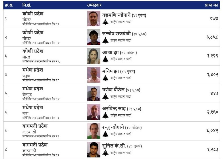 अहिले २७ वटा निर्वाचन क्षेत्रको मतगणना चलिरहँदा राष्ट्रिय स्वतन्त्र पार्टी (रास्वपा)ले २३ क्षेत्रमा अग्रता लिएको छ ।