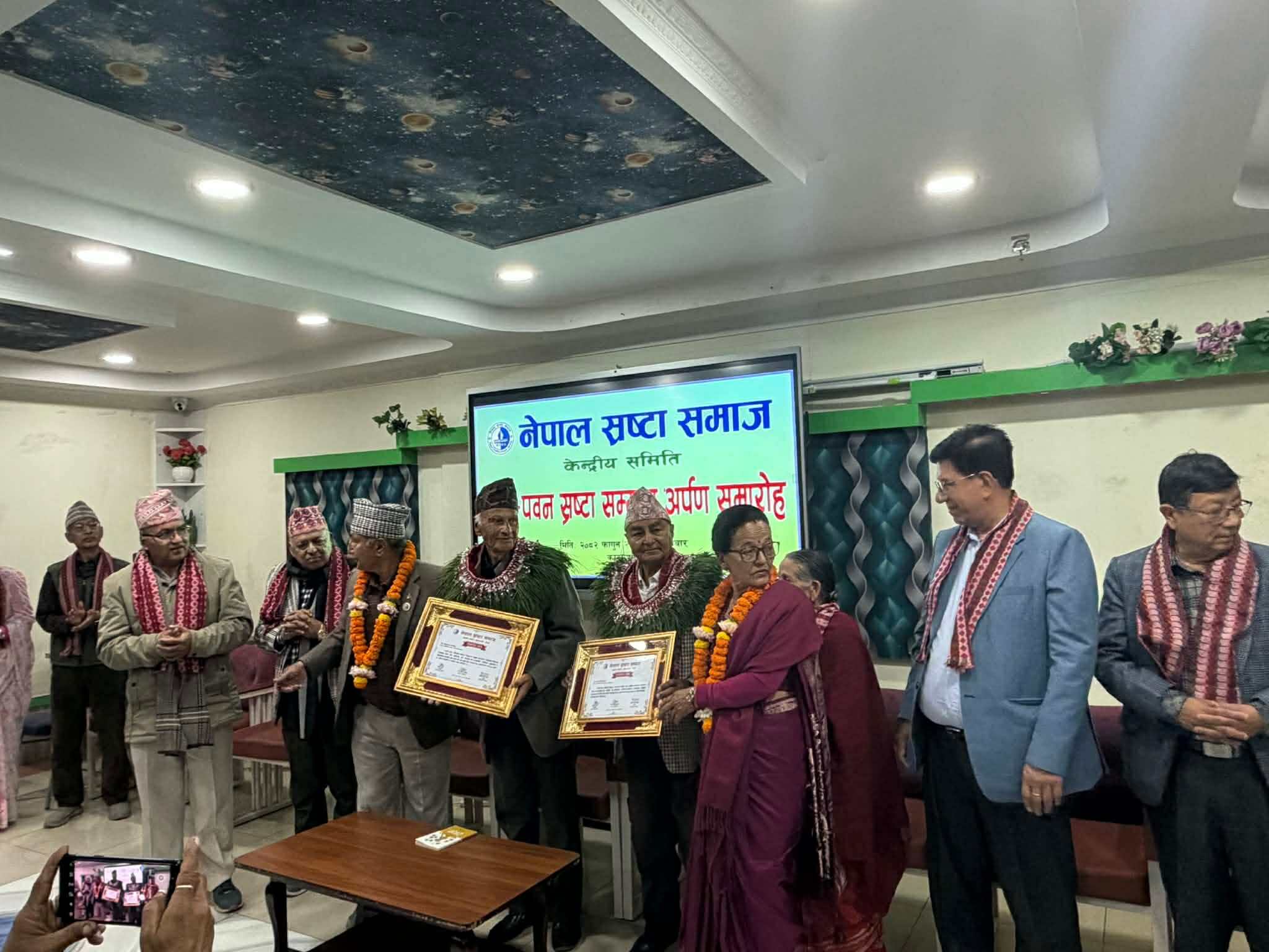 नेपाल स्रष्टा समाजको आयोजनामा राजधानीमा आईतबार आयोजित एक समारोहमा श्रीओम श्रेष्ठ ‘रोदन’,पवन आलोक,रेखा कंडेल लगायतले दोसल्ला,सम्मानपत्र,माला र नगदराशि सहित शर्मा र घिमिरेलाई संयुक्त रुपमा सम्मान अर्पण गरे ।