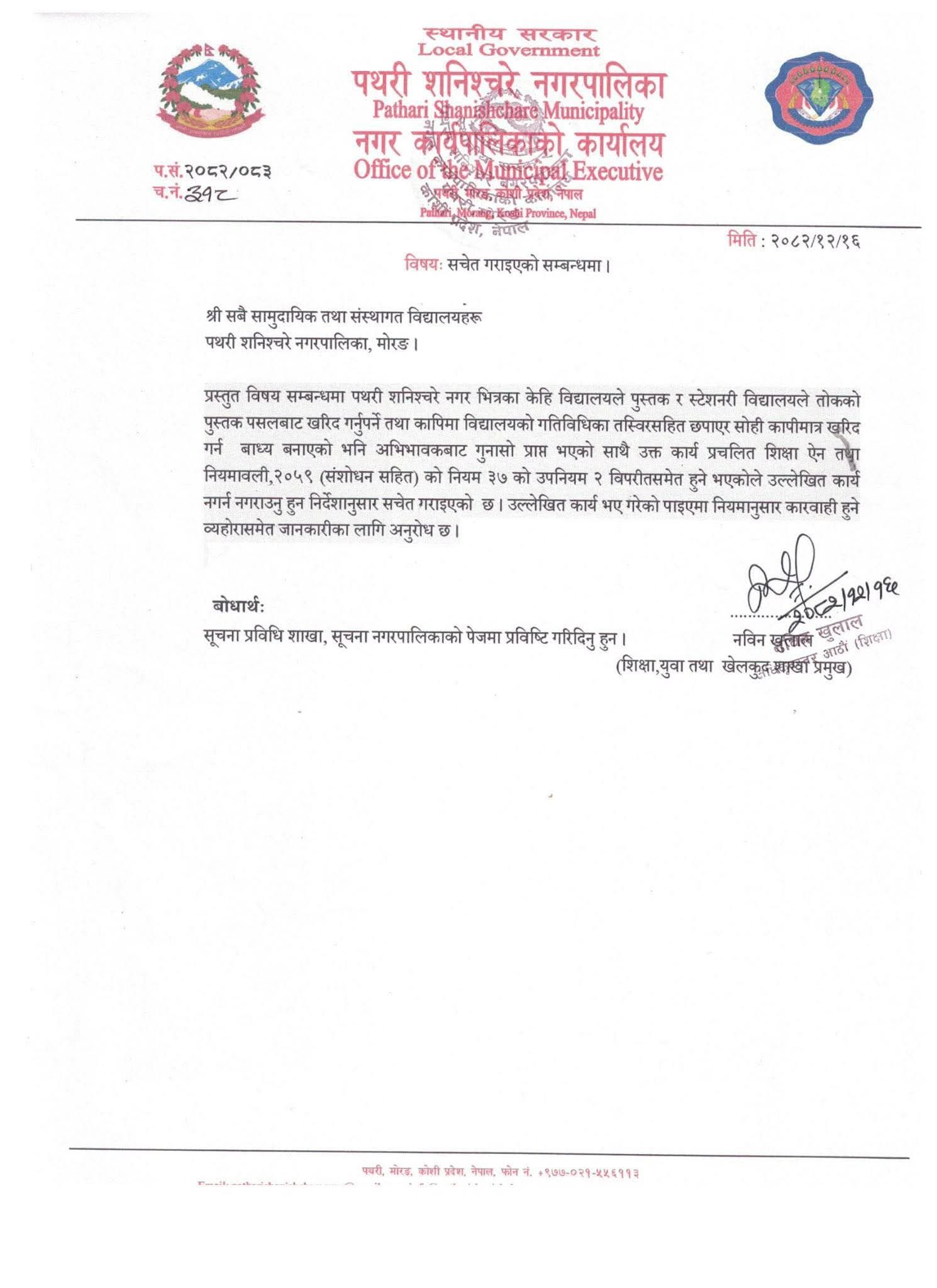विद्यालयलाई पुस्तक–स्टेशनरी खरिदमा बाध्यता नलगाउन पथरी शनिश्चरे नगरपालिकाको निर्देशन
