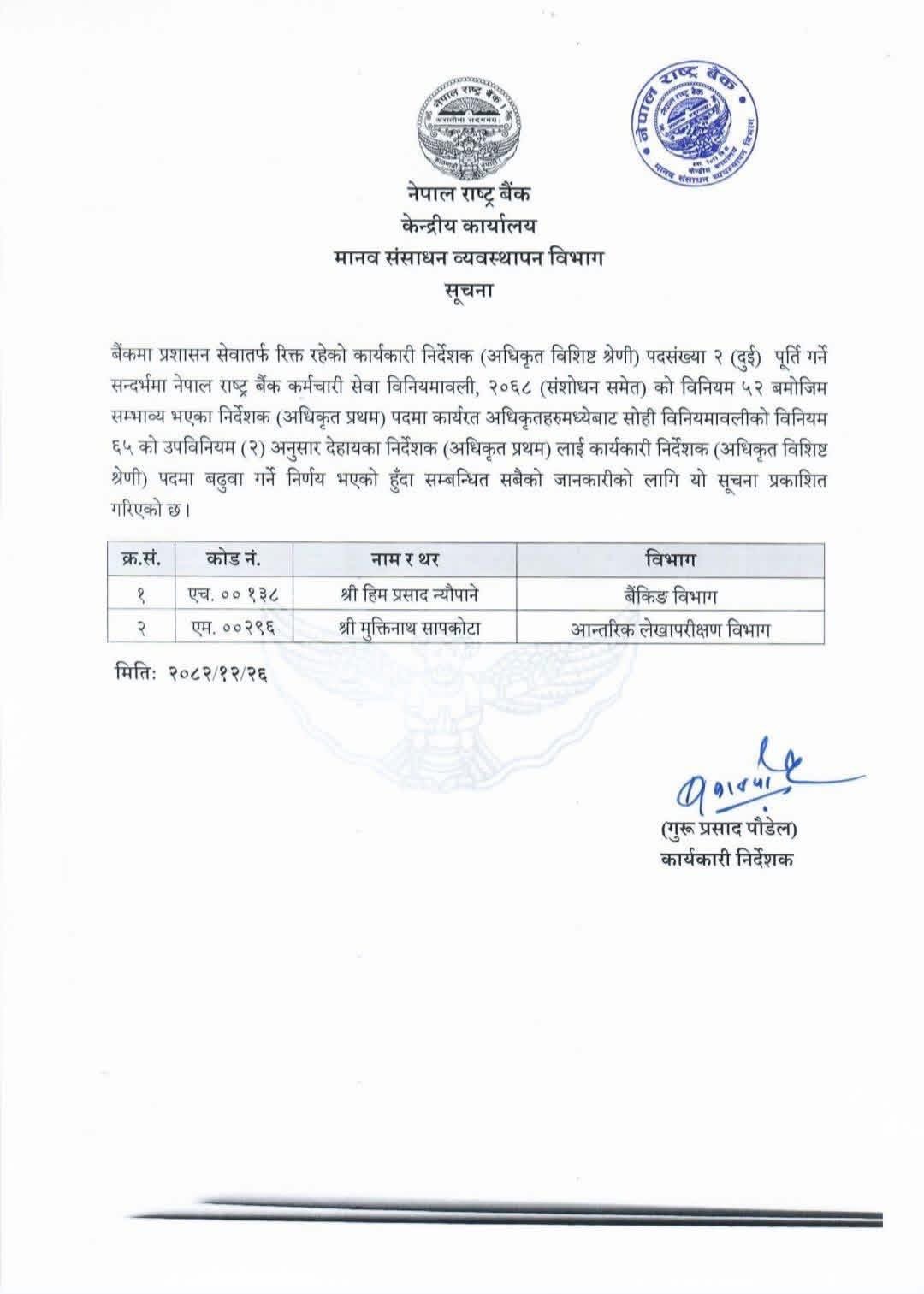 राष्ट्र बैंक कर्मचारी सेवा विनियमावली, २०६८ (संशोधनसमेत) बमोजिम सम्भाव्य भएका निर्देशक (अधिकृत प्रथम) पदमा कार्यरत अधिकृतमध्येबाट निर्देशक (अधिकृत प्रथम) लाई कार्यकारी निर्देशक (अधिकृत विशिष्ट श्रेणी) पदमा बढुवा गर्ने निर्णय भएको सूचना प्रकाशित गरिएको हो।