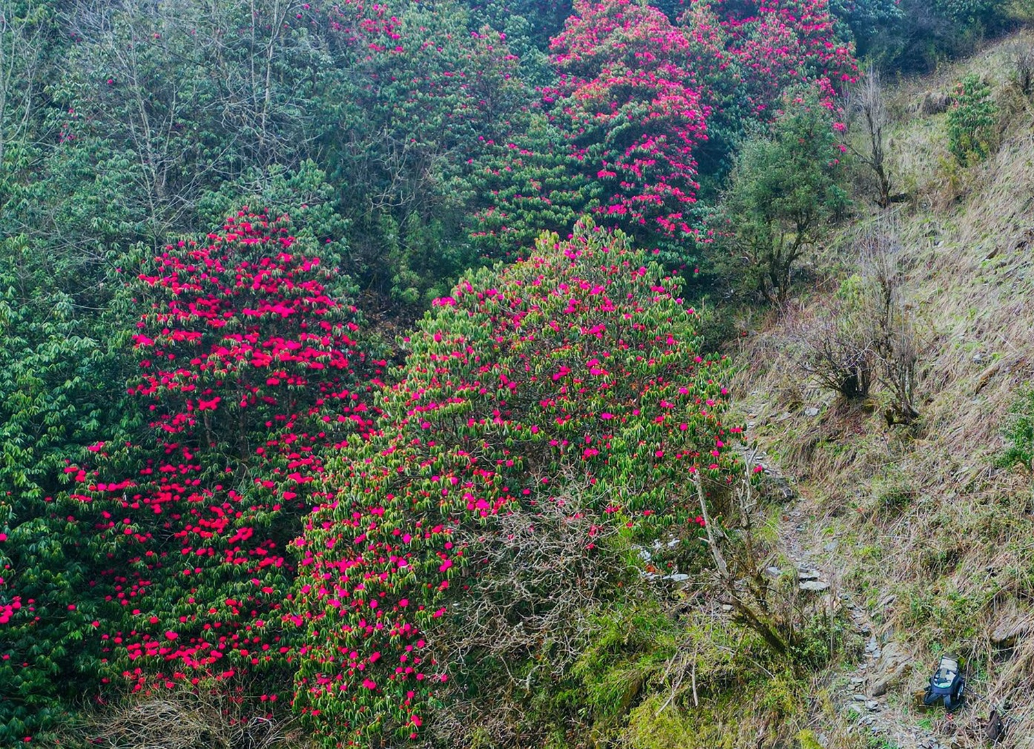 म्याग्दी । म्याग्दीको रघुगङ्गा गाउँपालिका–७ चिमखोलाको जङ्गलमा ढकमक्क फुलेको लालीगुराँस । चिमखोलादेखि सोवाङ धुरी जाने पदमार्गको यात्राका क्रममा लालीगुराँससहित जङ्गलको दृश्य अवलोकन गर्न पाइन्छ । तस्बिरः सन्तोष गौतम/रासस