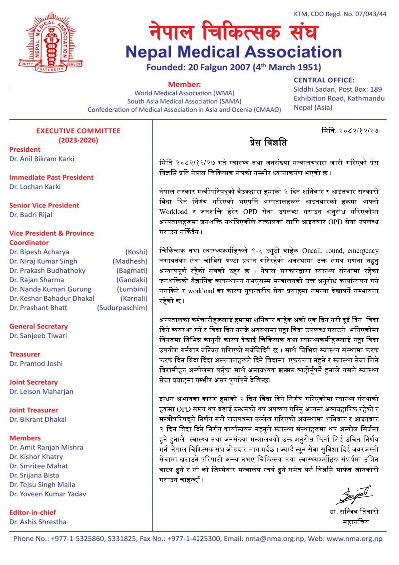काठमाण्डौ – स्वास्थ्य तथा जनसङ्ख्या मन्त्रालयले आइतवार पनि बहिरङ्ग (ओपीडी) सेवा सञ्चालन गर्न निर्देशन दिएपछि नेपाल चिकित्सक सङ्घले गम्भीर ध्यानाकर्षण भएको बताउँदै निर्णयमा पुनर्विचार गर्न माग गरेको छ ।