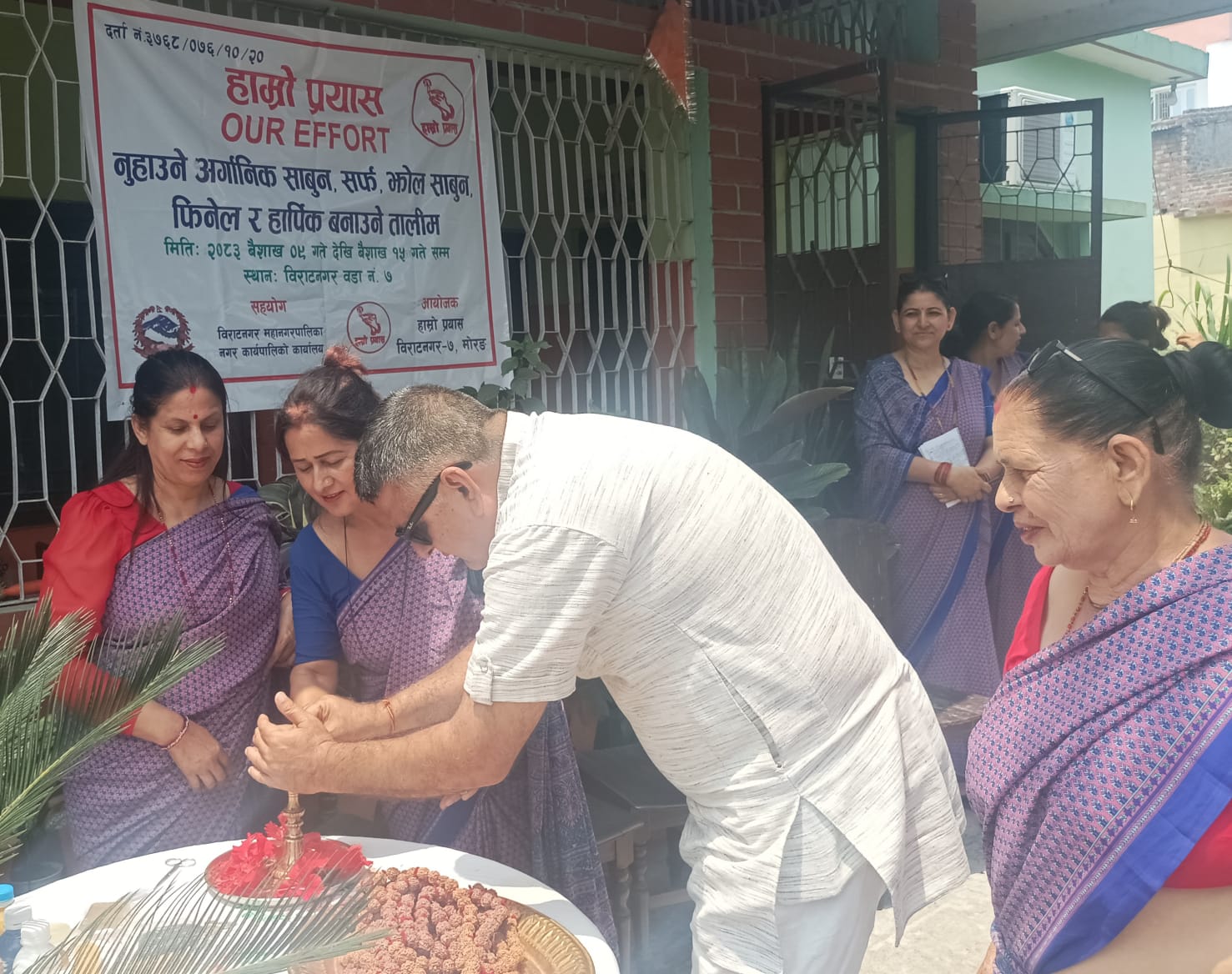 विराटनगर–७ मा अवस्थित सामाजिक संस्था **‘हाम्रो प्रयास’**को आयोजनामा अर्गानिक नुहाउने साबुन, सर्फ, लिक्विड झोल, फिनेल तथा ह्याण्डवास (हर्पिक) बनाउने एक साताको सीपमूलक तालिम उद्घाटन भै सुरु भएको छ। विराटनगर महानगरपालिकाको सहयोग तथा सहकार्यमा सञ्चालन गरिएको उक्त तालिम बैशाख ९ गतेदेखि १५ गतेसम्म सञ्चालन हुनेछ।
